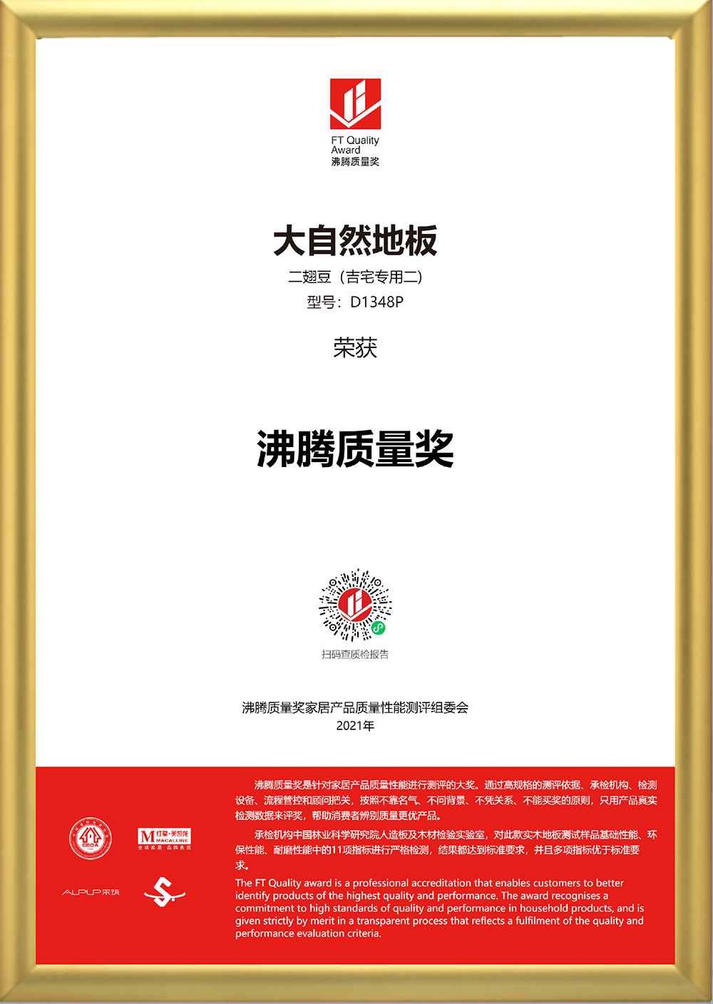 2021年大自然地板(二翅豆吉宅專用二,型號:D1348P)經(jīng)過權(quán)威機(jī)構(gòu)的檢測,其基礎(chǔ)性能、環(huán)保性能、耐磨性能表現(xiàn)出色,獲得沸騰質(zhì)量獎。作為大自然地板精工品質(zhì)的代表,大自然二翅豆實木地板,不僅有高顏值,而且有著“高內(nèi)涵”。甄選野生原木,材質(zhì)硬、密度大,具有良好的抗壓、耐磨實力,自然舒適、天然環(huán)保,一經(jīng)推出,就受到了消費者的青睞。優(yōu)異品質(zhì)背后,折射的是大自然多年來在深耕綠色環(huán)保產(chǎn)品領(lǐng)域的堅持。從地板到大家居,大自然地板不斷推動產(chǎn)品升級,以高于國家標(biāo)準(zhǔn)的制作水平,不斷進(jìn)行技術(shù)升級,助力健康家居生活打造。