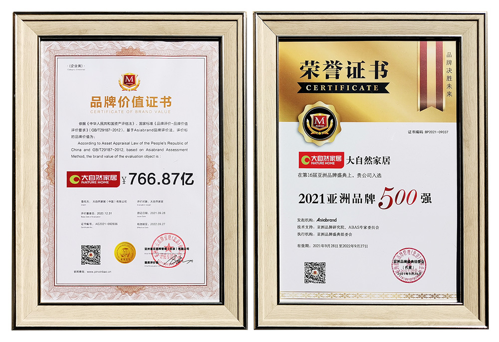 大自然家居發(fā)源于1995年,至今已有27年的歷史,一路走來憑借其強大的品牌實力及卓越的產(chǎn)品品質(zhì),受到了業(yè)內(nèi)的認(rèn)可和消費者的青睞。大自然家居在全球擁有8大原材料供應(yīng)基地,銷售網(wǎng)絡(luò)遍布全球,2021年品牌價值766.87億元。