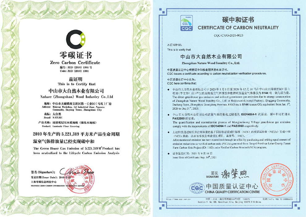 早在2010年,大自然家居就創新推出了零碳地板,并獲得零碳證書,產品進入了上海世博會零碳館。2021年9月,大自然家居通過了中國質量認證中心的碳中和認證,獲得了行業第一張碳中和證書。