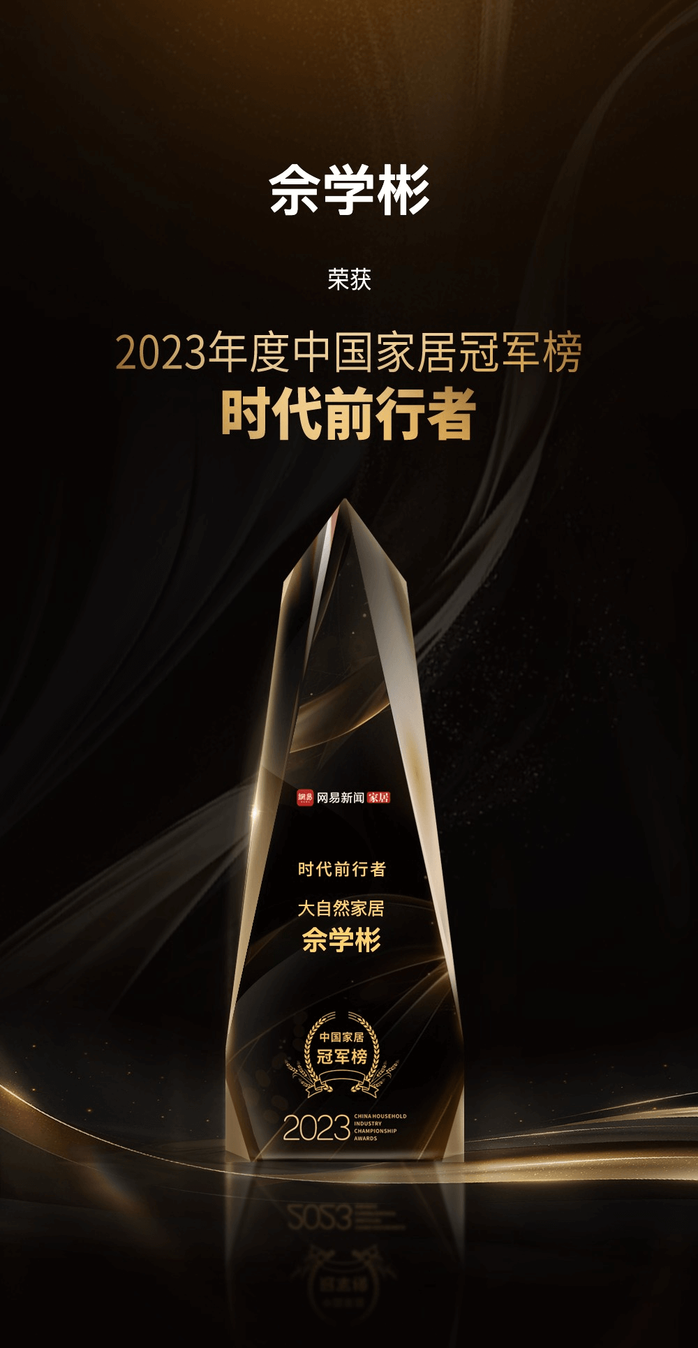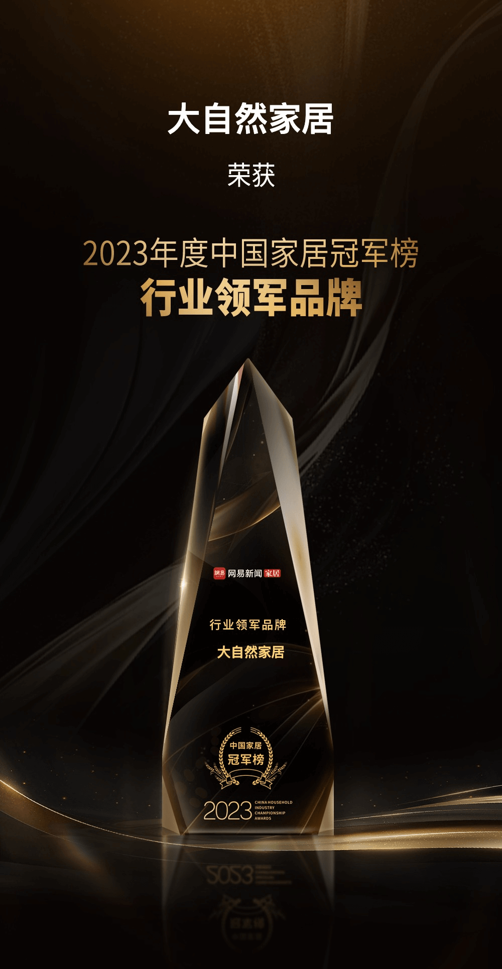 2023年12月27日,“向好生活提案——2023網易中國家居冠軍榜頒獎盛典”隆重舉行,各大獎項重磅揭曉,匯聚冠軍品牌能量,書寫家居行業全新華章。大自然家居榮獲2023中國家居冠軍榜“行業領軍品牌”獎項,與此同時,大自然家居集團董事長佘學彬先生被授予“時代前行者”榮譽稱號,集團常務副總裁佘嘉浚先生榮獲“年度杰出青年領袖”榮譽稱號。